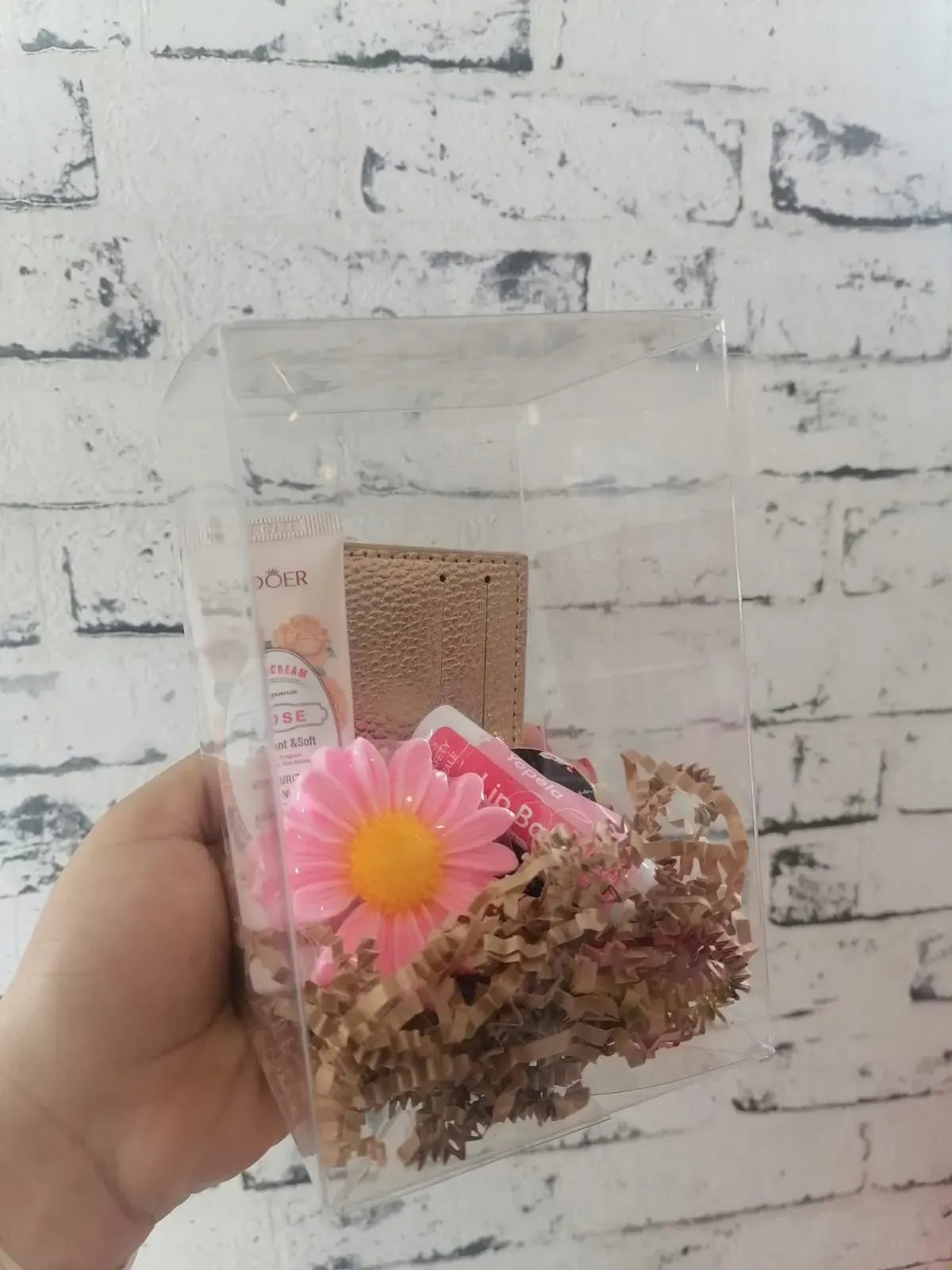 envoltura en caja transparente con lazo en satin y tags de temporada.