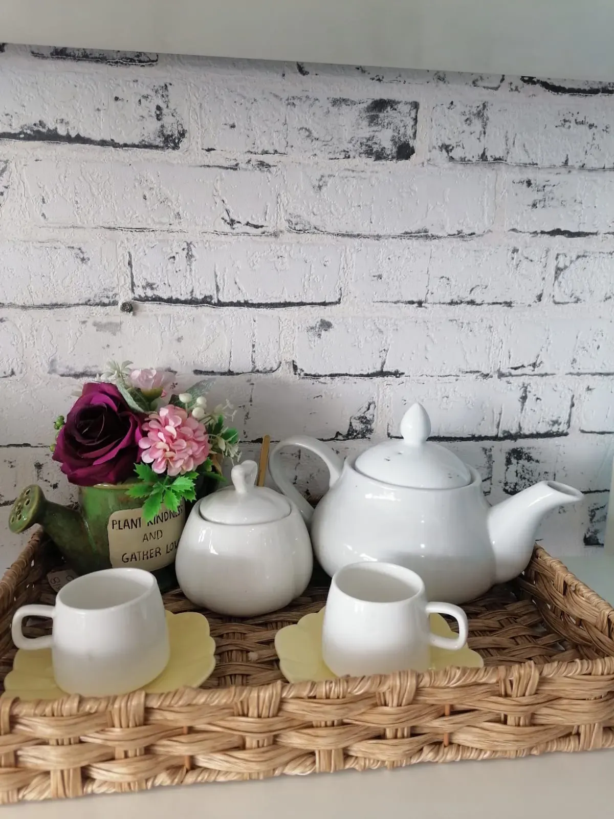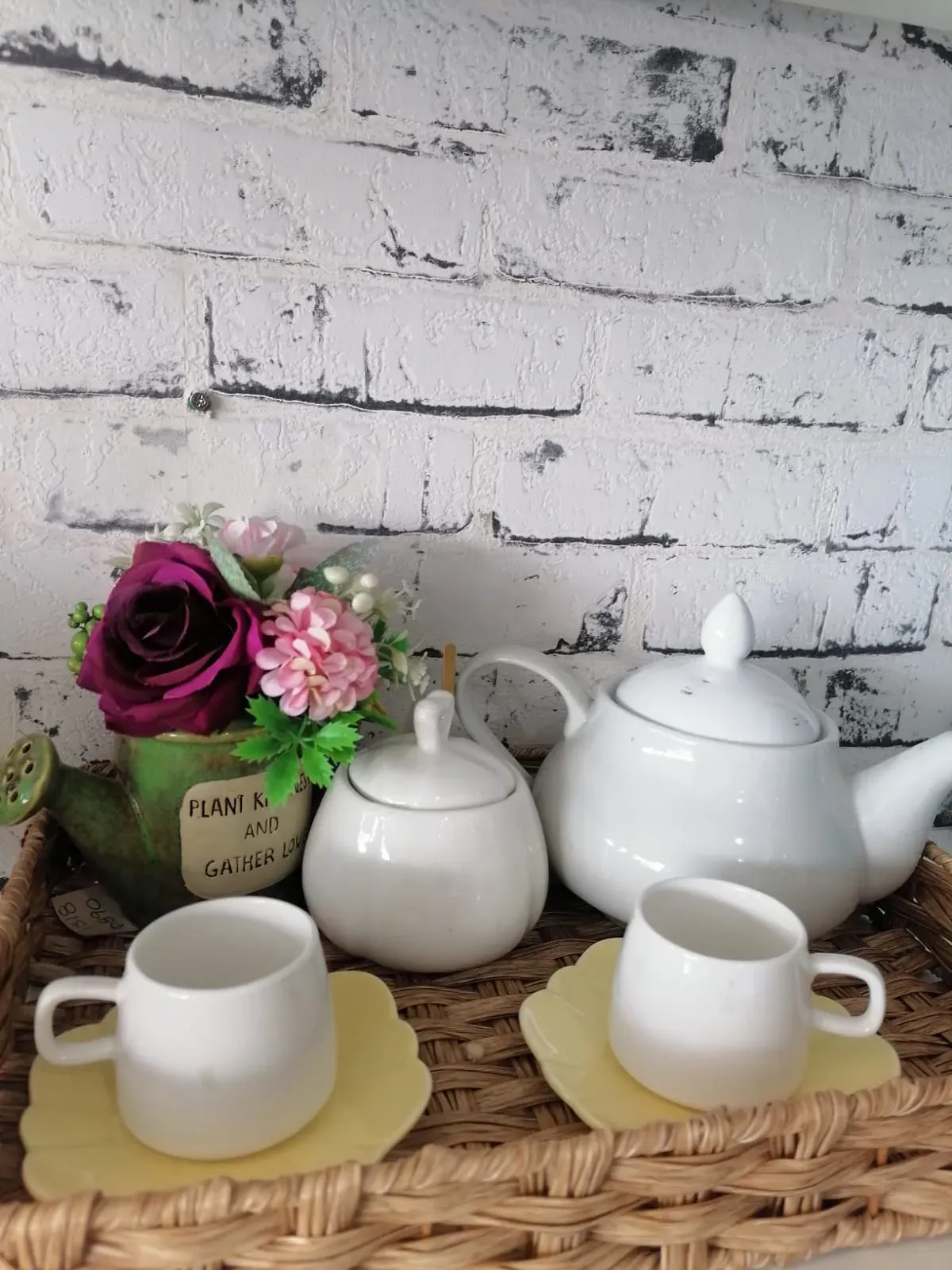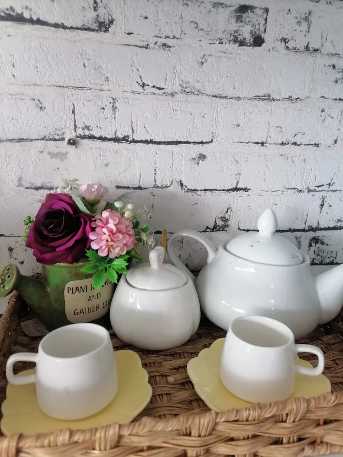 INCLUYE: 2 TAZAS MINI DE CERAMICA CON PLATO, 1 TETERA GRANDE DE CERAMICA, 1 AZUCARERA DE CERAMICA, 1 CUCHARA DORADA DE METAL, 1 PUCHERO PEQUEÑO CON FLORES ARTIFICIALES Y BASE DE CERAMICA, 1 BANDEJA DE MIMBRE Y ENVOLTURA EN PAPEL CELPHAN CON LAZO EN CINTA SATIN.
