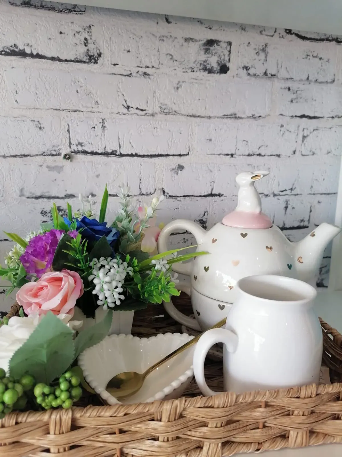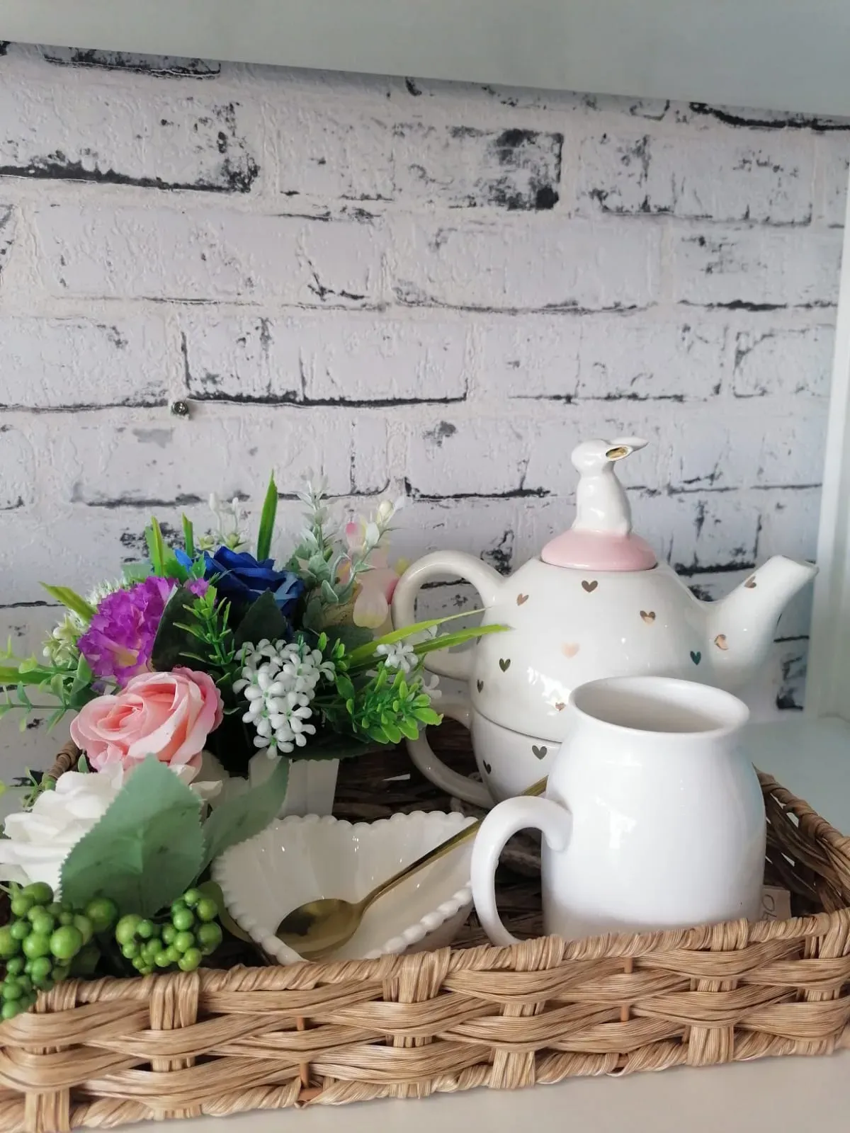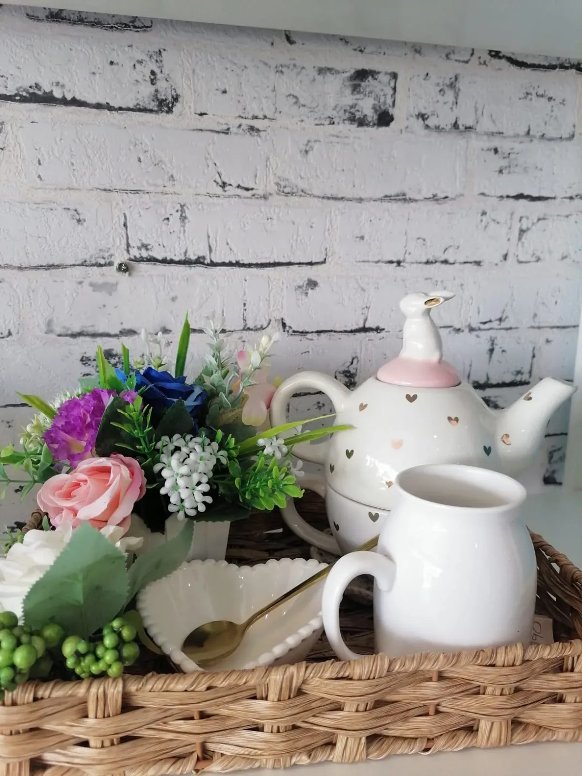 INCLUYE: 1 TETERA Y 1 TAZA A JUEGO CON DETALLES DE CORAZONES EN CERAMICA, 1 PORTACUCHARAS EN FORMA DE CORAZON EN CERAMICA COLOR BLANC0, 1 CUCHARA DE METAL, 1 PUCHERO MEDIANO CON FLORES ARTIFICIALES, 1 BANDEJA DE MIMBRE, ENVOLTURA EN PAPEL CELOPHAN CON LAZO EN CINTA SATIN.