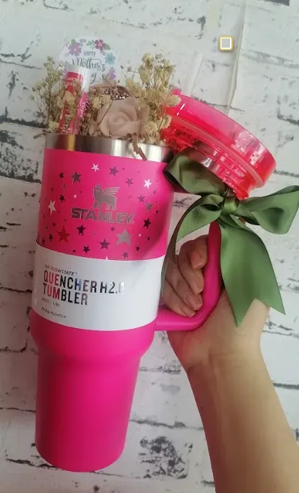 1 bálsamo hidratante, 1 espejo de bolsillo, 1 jabón en forma de flor, 1 crema hidratante de manos, 1 termo stanley de 40 oz con sorbete plástico, lazo en cinta satin sencillo